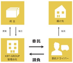 軽貨物委託会社とは、荷物の依頼主(荷主)から配送業務を受託し、軽貨物ドライバーに配送業務を委託する会社のことです。荷物主とドライバーの間に立って、受注管理、請求と支払、ドライバーの業務支援を行っています。弊社もそのような軽貨物委託会社のうちの1つとなります。